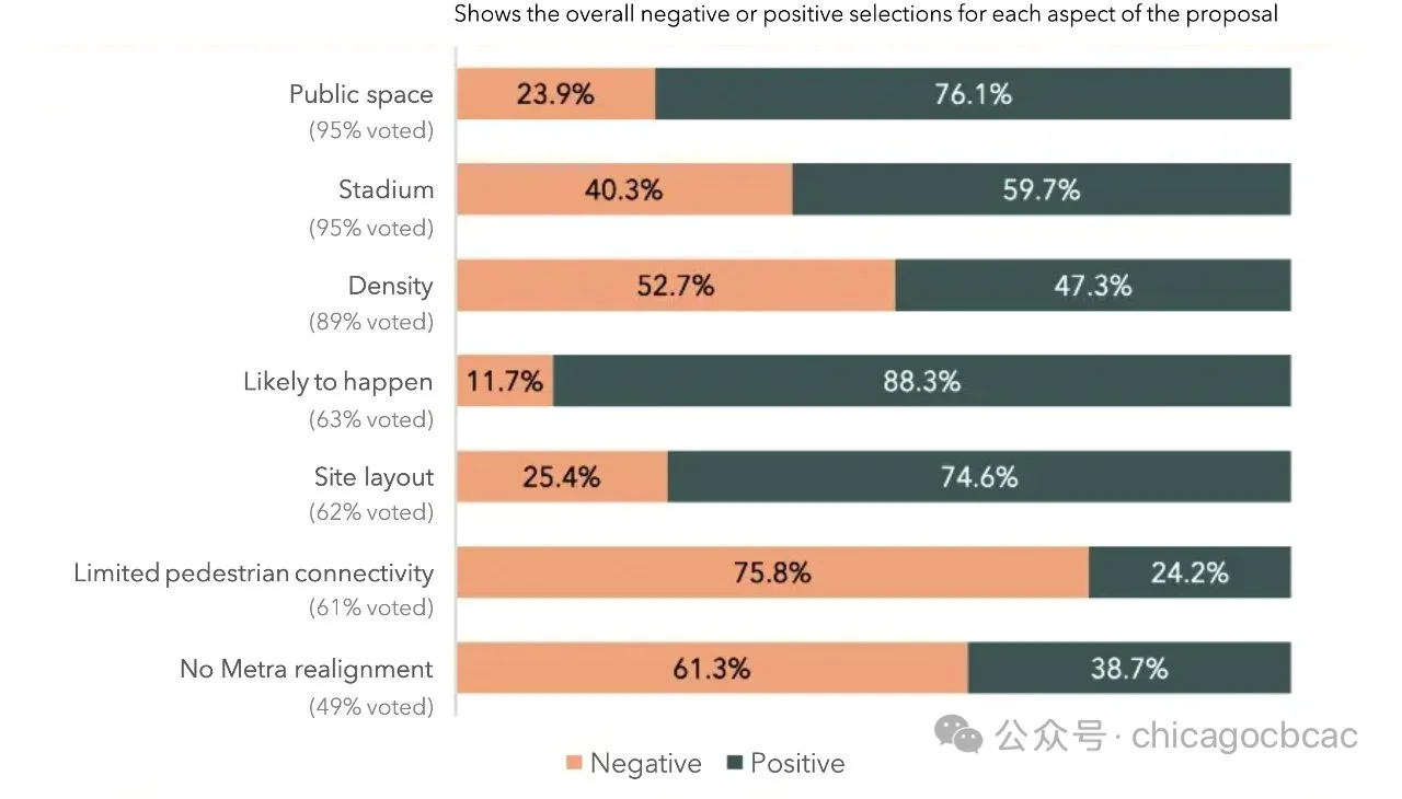 這也是為什麽我們想要“翻轉”《芝加哥凱恩商業周刊》(Crain's Chicago Business)最近關于南環區(South Loop)居民回應火焰隊球場提案的文章(《South Loop residents weigh in on Chicago Fire stadium plan》,8月14日發布,問卷主要內容見下文)。與其引用一份問卷結果,得出社區對該項目“基本支持,只是有一些附加條件”的結論,更准確的理解應當是:這些附加條件必須得到解決,鄰居們才可能全面支持這一提案。