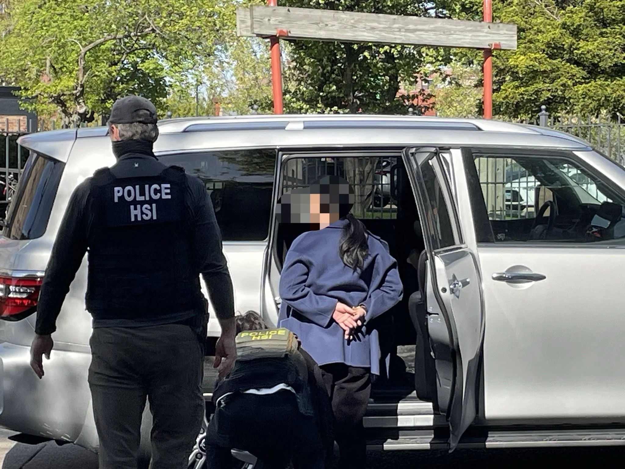執法人員身著印有“POLICE HSI”字樣的背心,HSI為美國國土安全調查局,主要進行移民相關調查