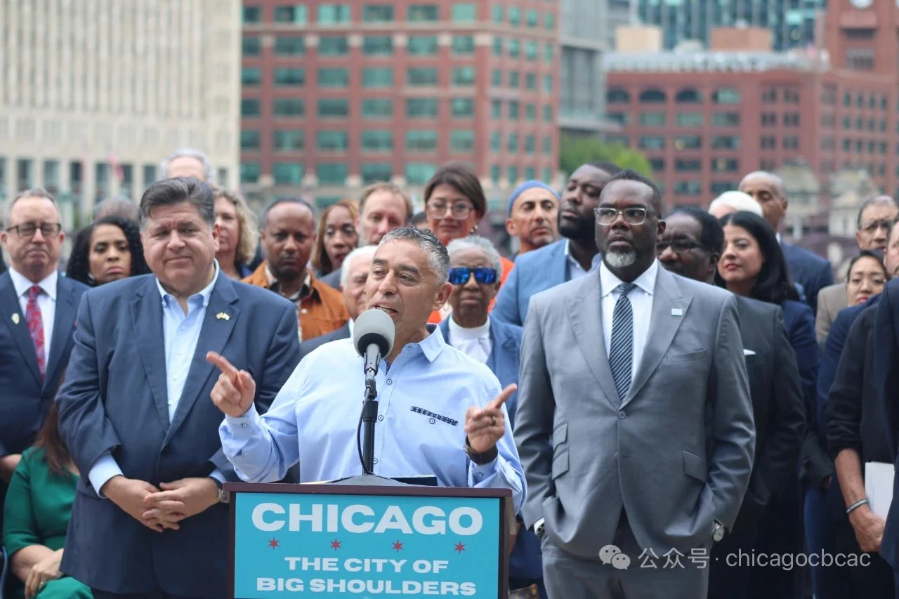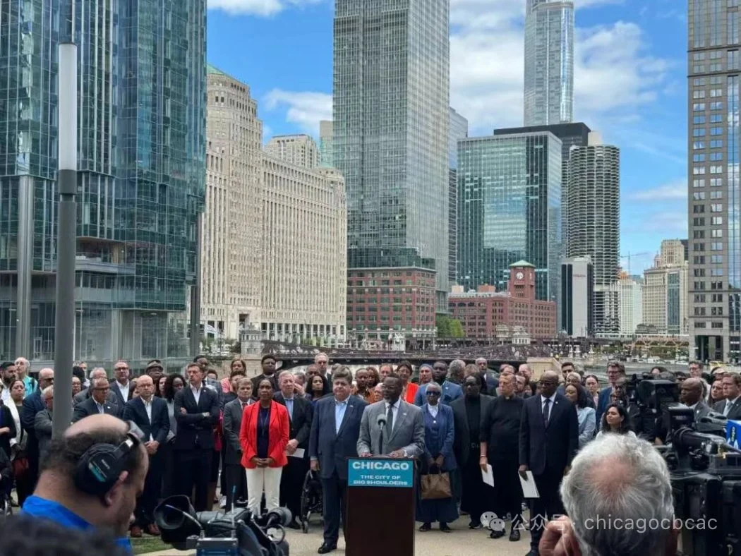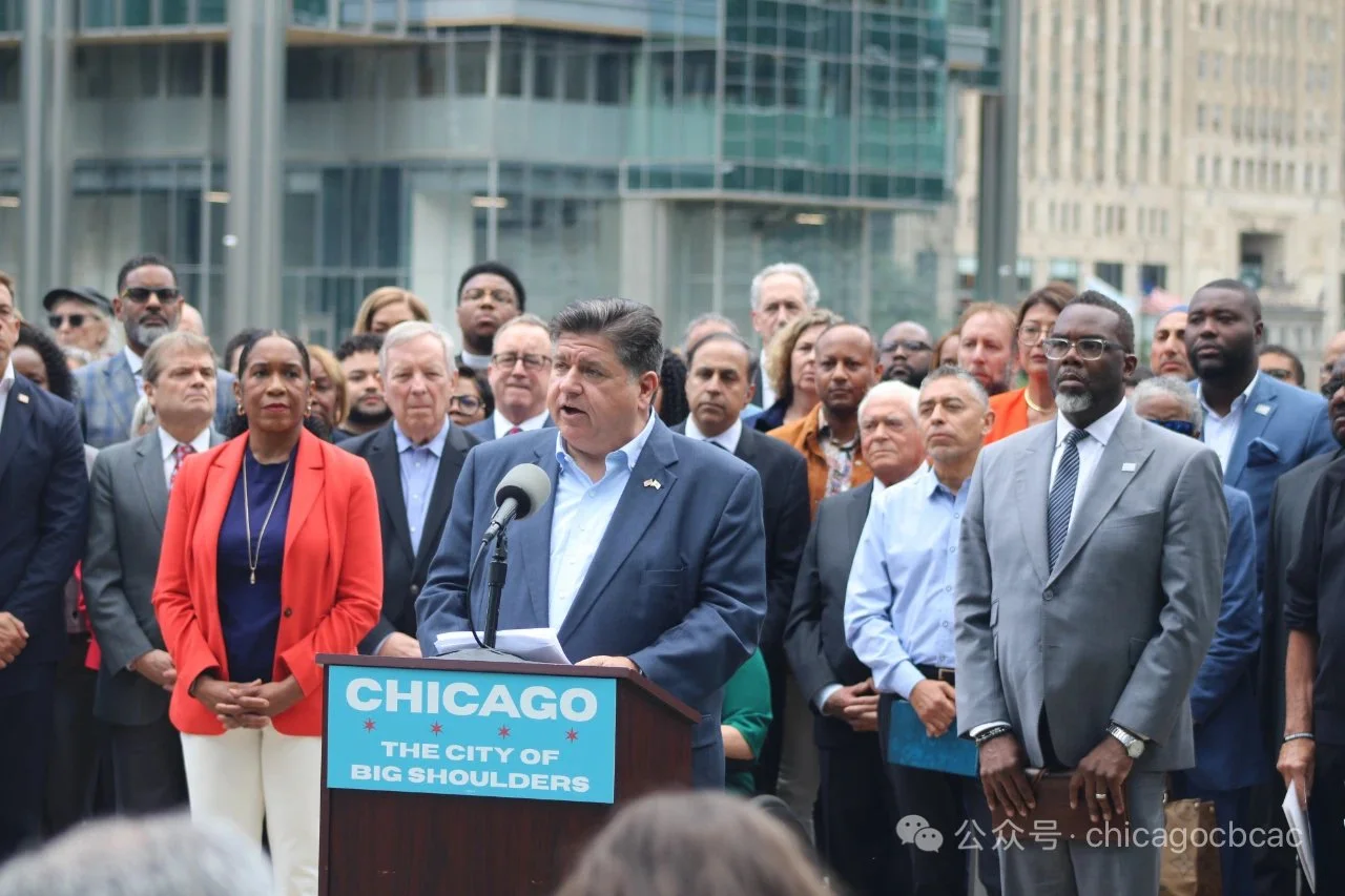 8月25日下午,在芝加哥市中心邊緣的河畔公園(River Point Park),伊利諾伊州州長普利茲克(JB Pritzker)與他的州政府同僚、芝加哥市長、執法部門、商界、宗教界、教育界和當地社區代表站在一起,回應特朗普計劃向芝加哥派兵的消息。