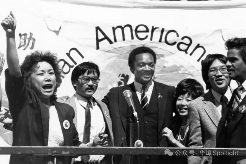 1984年,傑西·傑克遜(中)在舊金山唐人街舉行集會,爲在底特律被殺害的陳果仁(Vincent Chin)爭取正義。活動人士Eddie Wong和Mabel Teng(右起第二和第三位)與傑克遜一同出席。(圖片來源:芝加哥太陽報)