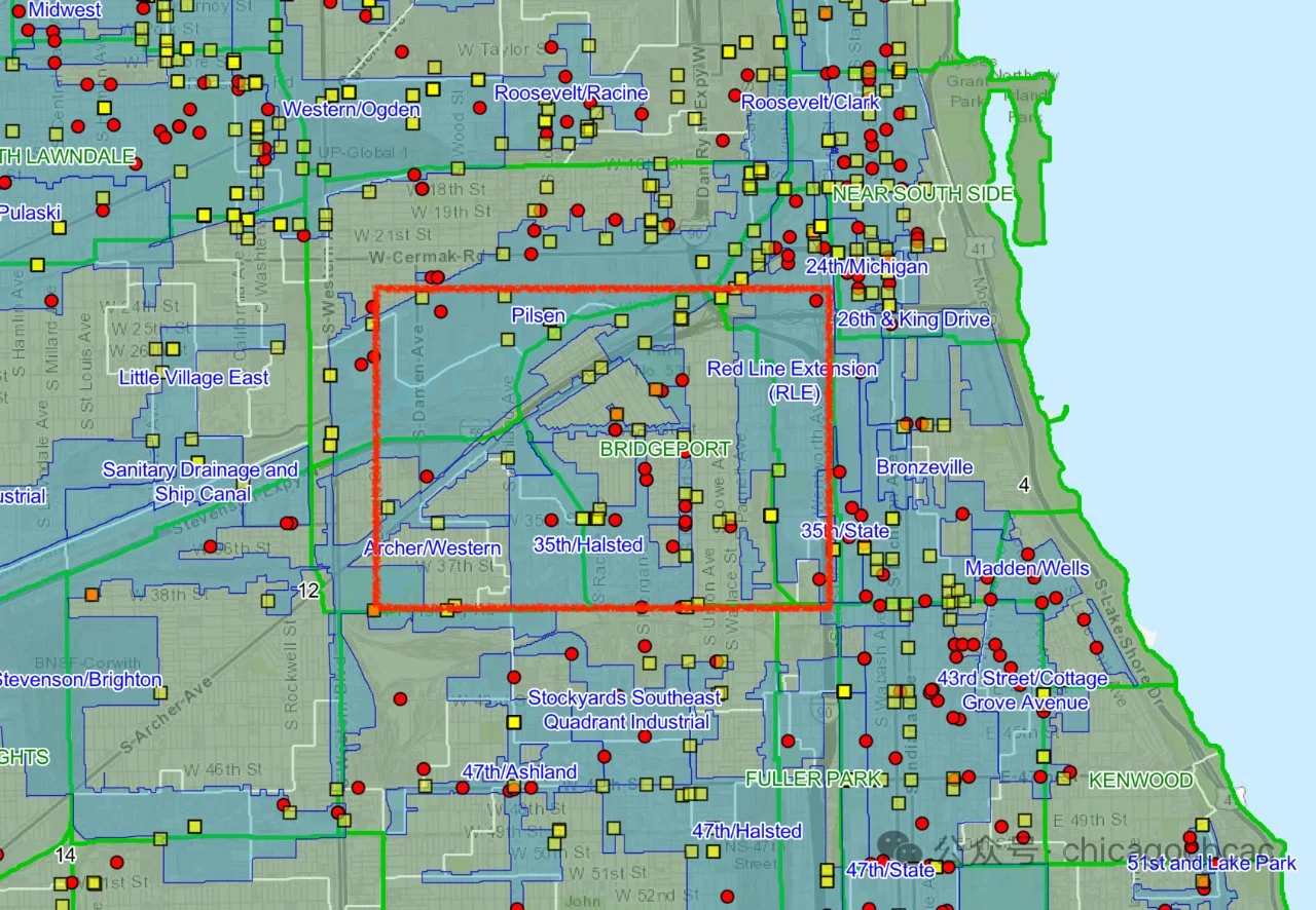 芝加哥市部分TIF示意圖(淺藍色陰影部分爲TIF區),紅框內爲11區附近的TIF區